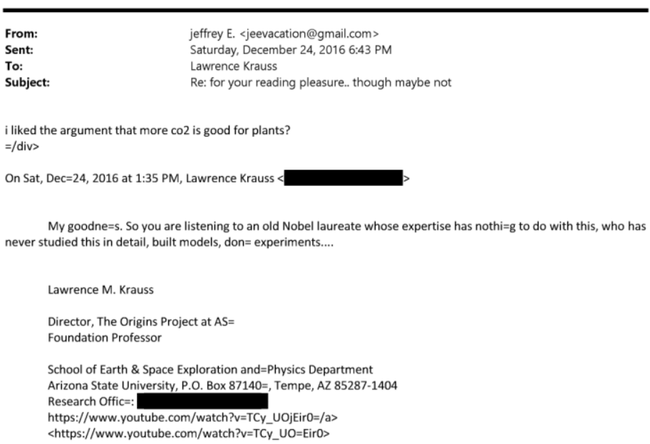 Dans l’un des échanges les plus marquants, Epstein, le financier et délinquant sexuel condamné, engage Krauss sur des sujets de désinformation climatique bien connus. Epstein écrit : « J’ai aimé l’argument selon lequel plus de CO2 est bon pour les plantes ? » Ce à quoi Krauss répond en réfutant le mythe : « Il a choisi des données de manière sélective, l’acte typique de ceux qui croient à une réponse avant de poser la question. » Malgré les tentatives de Krauss pour contrer la désinformation d’Epstein, l’échange souligne l’insistance de ce dernier à promouvoir des mythes nuisibles qui remettent en cause le consensus scientifique sur le changement climatique.